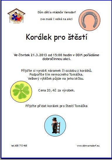 Ve čtvrtek 21.3.2013 od 15:00 hod. se bude konat dobročinná akce. Všichni jsou srdečně zváni.